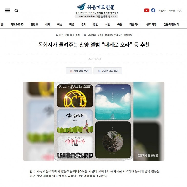 [기획기사] 목회자가 들려주는 찬양 앨범 “내게로 오라” 등 추천(복음기도신문)