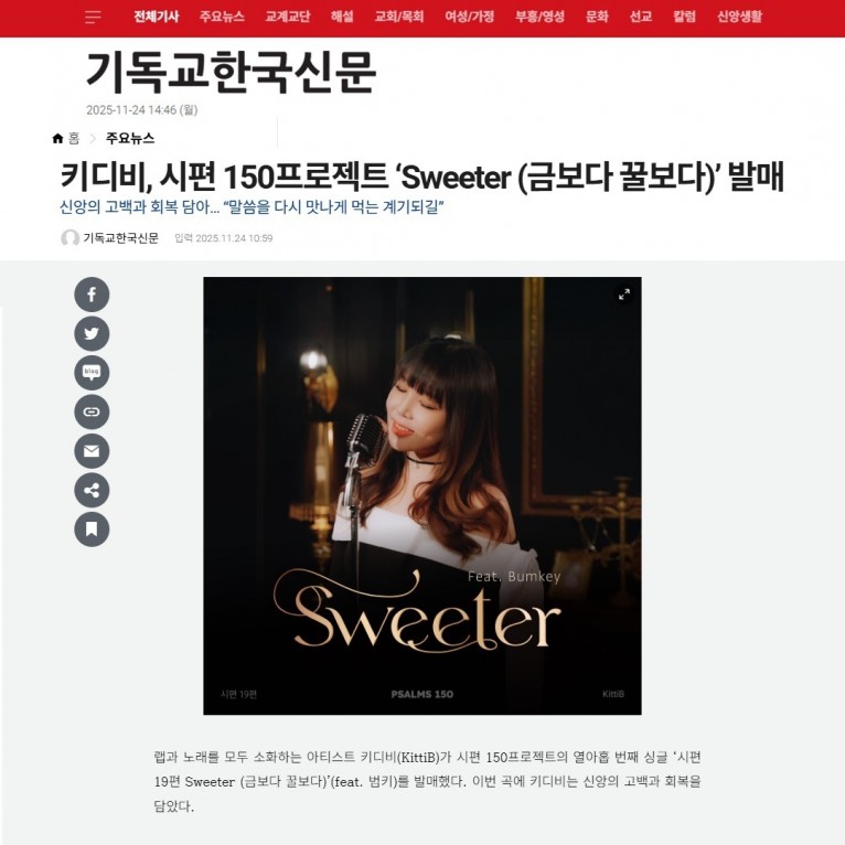 [기사] 키디비, 시편 150프로젝트 ‘Sweeter (금보다 꿀보다)’ 발매(기독교한국신문)
